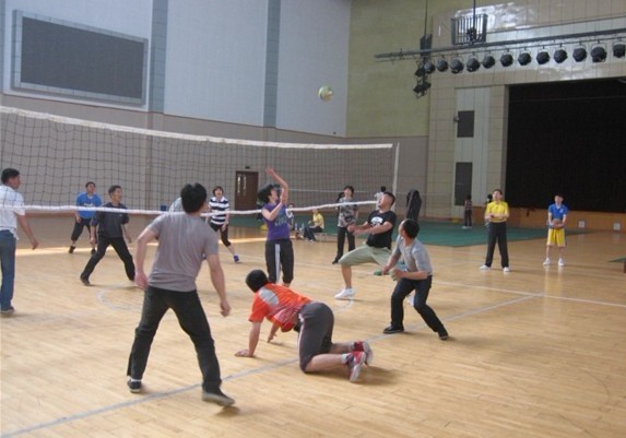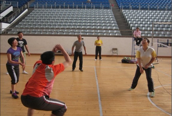 4月11日下午两点,风雨操场排球场进行了一场别开生面的排球赛,哨子声、加油声、叫喊声交织在一起,引得清卫人员驻足观看。原来这里进行的是体军部教研活动,运动员是体育老师,裁判员是排球班学生。由阮志勇老师和应政老师任队长的两队势均力敌,比赛处于白热化状态,期间曾出现23:21的激烈比分,最终“软勇”队以2:1险胜“硬朗”队。