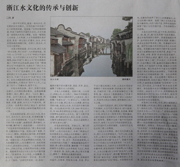 5月30日,中国水利报刊登永利水文化研究所闫彦教授文章《浙江水文化的传承与创新》,链接地址:http://www.chinawater.com.cn/slb/ 。现全文刊载如下,以飨读者: