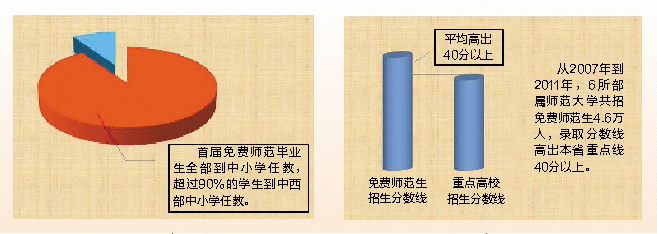 教育、人力资源和社会保障、机构编制、财政等部门以及各地方政府采取多种举措,确保免费师范生到基层就业。经过多方努力,2011年首届免费师范生就业进展顺利,毕业生全部落实岗位、全部到中小学任教。在直属师范大学师范生免费教育的带动下,新疆、上海等地方师范生免费教育政策陆续推出,教育强国战略正在奠定更加坚实的根基。