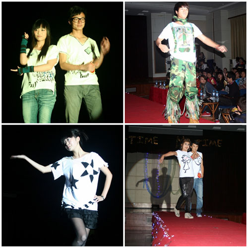 大赛以精彩而新颖的投影剧拉开帷幕,展示了当代学生从高中到大学生活中的点点滴滴,赢得在场观众的阵阵喝彩。随后各位参赛选手依次出场展示自己设计的T恤。一件件简单的白色T恤在同学们的妙手下变成了简约时尚的艺术品。以森林为主题的,清新自然;以海洋为主题的,温馨浪漫;以报纸等为原材料的,简约环保。中场的互动小游戏,也掀起了观众不小的尖叫声。之后的比赛更加精彩,同学们的创意也更是层出不穷,最后更有水利系团总支学生会各部门部长穿着自己设计的T恤闪亮登场,令现场尖叫连连。