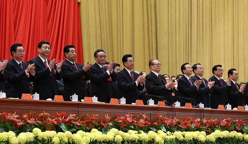 11月14日,中国共产党第十八次全国代表大会在北京人民大会堂胜利闭幕。这是胡锦涛、江泽民、吴邦国、温家宝、贾庆林、李长春、习近平、李克强、贺国强、周永康鼓掌祝贺大会胜利闭幕。新华社记者 庞兴雷 摄