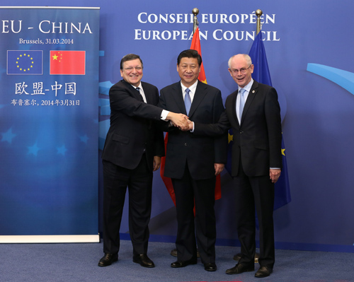 3月31日,长达5个小时里,习主席先后同欧洲理事会主席范龙佩、欧洲议会议长舒尔茨、欧盟委员会主席巴罗佐会谈会见。
