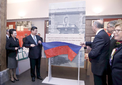 3月26日,国家主席习近平在法国参观里昂中法大学旧址。这是习近平和夫人彭丽媛与法国外长法比尤斯、里昂市长科隆共同为中国-里昂关系促进中心、里昂中法大学历史博物馆揭牌。 新华社记者鞠鹏摄