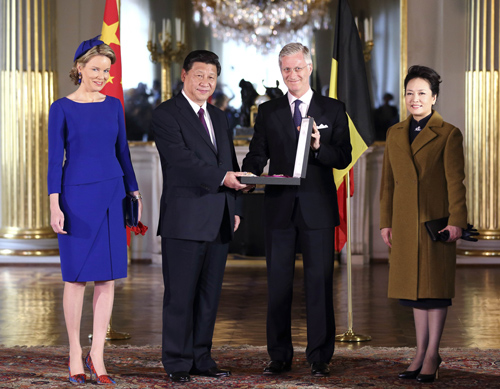 3月30日,国家主席习近平在布鲁塞尔会见比利时国王菲利普。这是菲利普国王向习近平授予利奥波德大绶带勋章和证书。 新华社记者兰红光摄