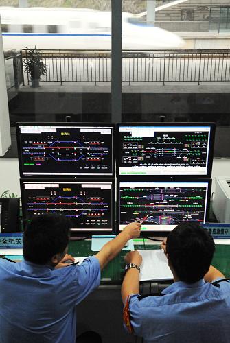 6月28日,两位工作人员在宁杭甬高铁浙江德清站行车监控室观察来往高铁试验车的运行状况。新华社记者谭进摄