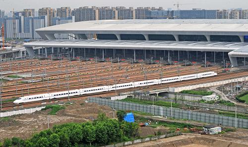 6月30日,一列高铁试验车缓缓驶入中国最大铁路枢纽——宁杭甬高铁浙江杭州东站。南京至杭州(宁杭)、杭州至宁波(杭甬)的高速铁路将于7月1日开通运营,6月27日起对外售票。这标志着继沪宁、沪杭高铁建成通车后,长三角地区的高铁三角网络正式形成。宁杭甬高铁由总长约400公里的宁杭高铁和杭甬高铁全线拉通组成,设计时速350公里,初期运营时速300公里。宁杭高铁北起南京,南至杭州,营业里程256公里,全线共设11个车站。杭甬高铁西起杭州,东至宁波,营业里程155公里,共设7个车站。宁杭、杭甬高铁投入运营后,杭州至南京最快运行时间70分钟,杭州至宁波最快运行时间53分钟,上海至宁波最快运行时间100分钟,均比原来缩短近一半时间。这意味着长三角“一小时经济圈”基本形成。新华社记者谭进摄
