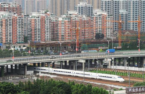 6月30日,一列高铁试验车行驶在宁杭甬高铁浙江杭州主城区段。新华社记者谭进摄