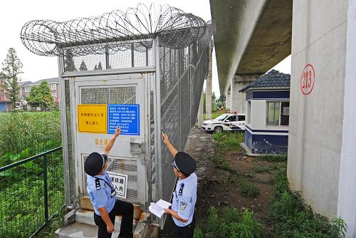 6月29日,浙江德清铁路派出所的两位民警在检查宁杭甬高铁一处应急疏散通道的安全防护设施。新华社记者谭进摄