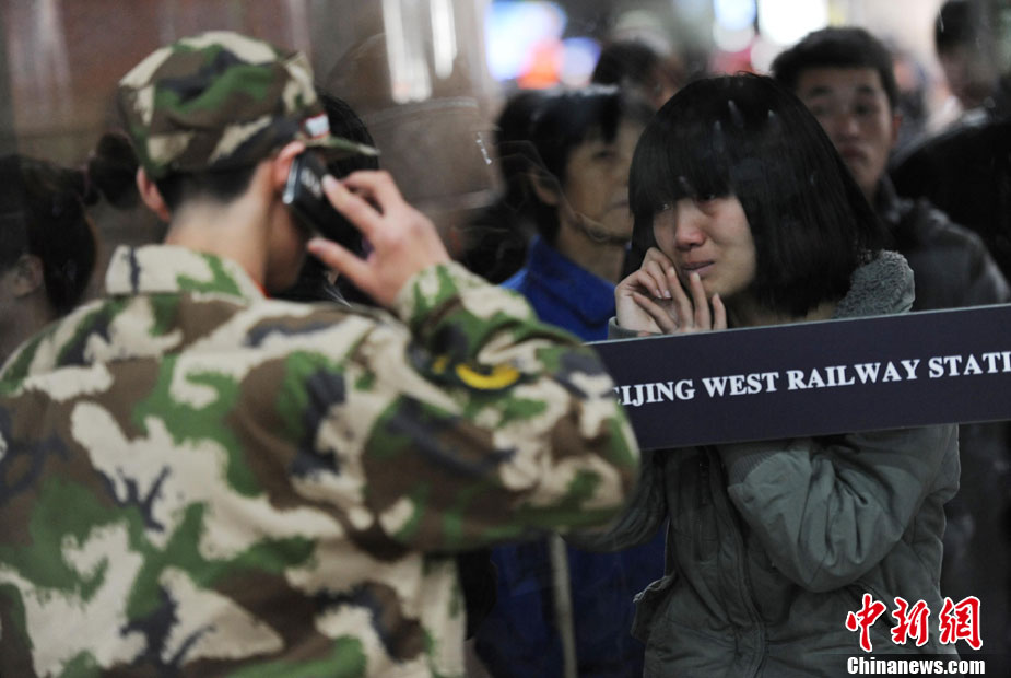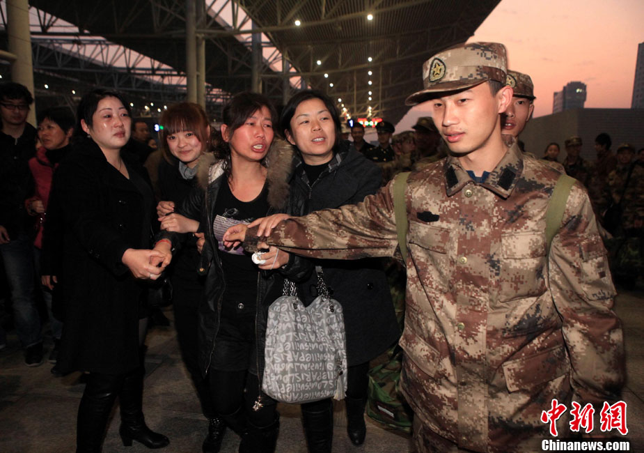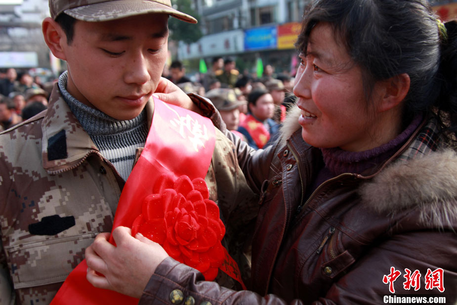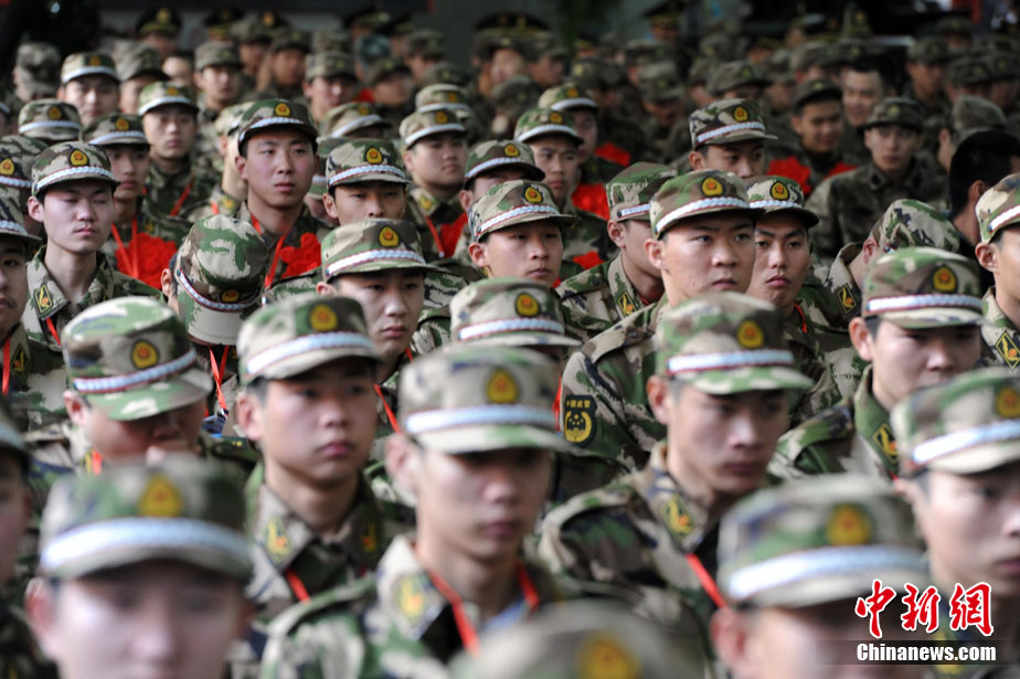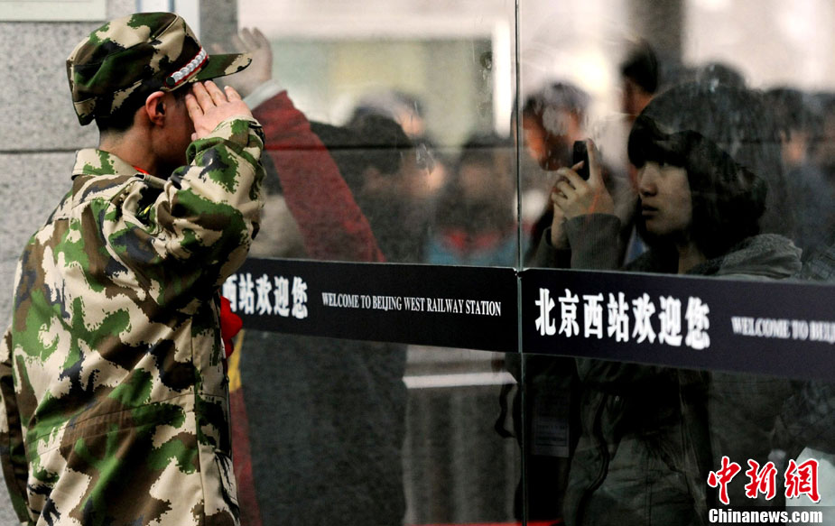 12月10日,北京市在西客站举行隆重的欢送首批新兵仪式。来自东城、西城、朝阳、海淀等14个区的500名新战士身穿军装,胸带红花,即将奔赴四川、陕西、湖北、河北等地军营。北京市征召的新兵中,高校毕业生和在校生超过了三分之一。 中新社记者 杜洋 摄