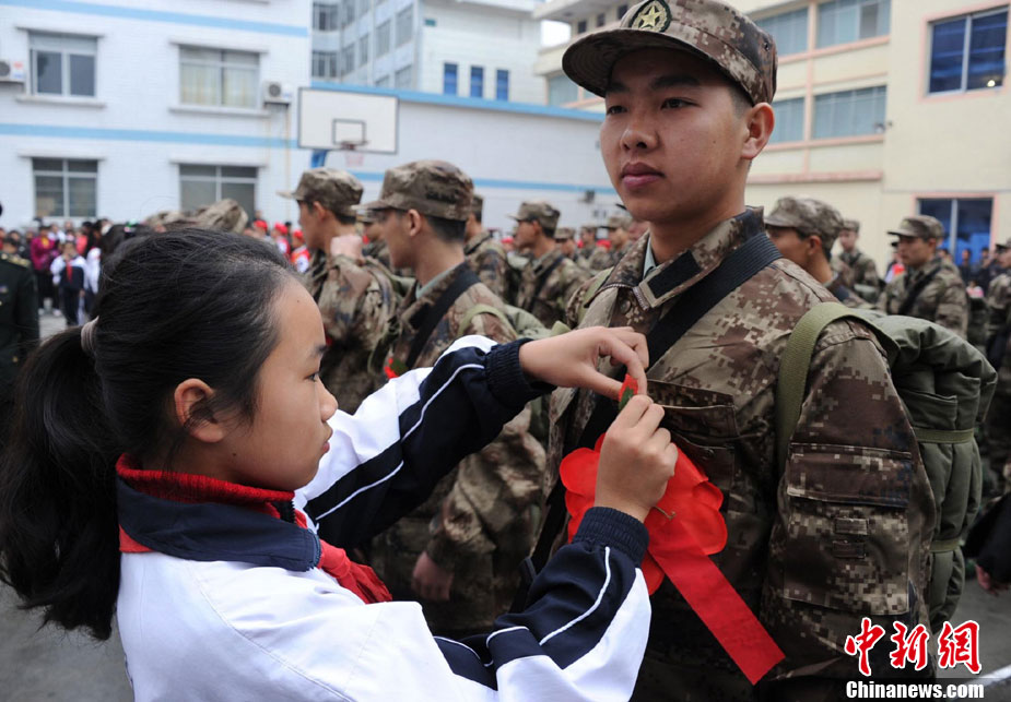 12月10日,在广西罗城仫佬族自治县,少先队员给新兵戴上大红花。当日,仫佬山乡第一批新兵入伍欢送大会在该县武装部隆重举行,上万民众和学生前来欢送,场面十分壮观。这批新兵共有50名,将前往广东服役。据悉,当日还有都安、宜州等地的300多名新兵一同踏上广东的征程。中新社发 吴耀荣 摄