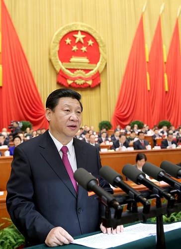 3月17日,第十二届全国人民代表大会第一次会议在北京人民大会堂举行闭幕会。这是中华人民共和国主席习近平发表重要讲话。新华社记者 兰红光 摄