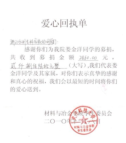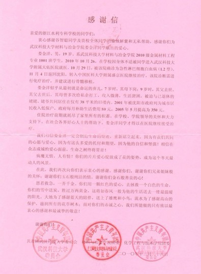“恩若救急,一芥千金。你们用一颗红色的爱心,去拯救一个白色的生命,你们的雪中送炭,胜过万两黄金。”这是武汉科技大学对谷智聪、对水专的感谢,感谢满怀爱心的你们。