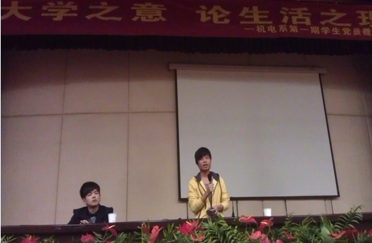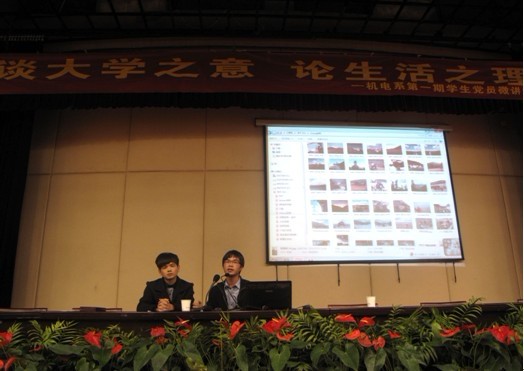 2011年11月29日晚,在学校温州厅,机电系党总支开展了主题为“谈大学之意,论生活之理——机电系第一期学生党员微讲坛”活动。系大一全体同学和大二、大三的入党积极分子和党员听取了本次讲座。