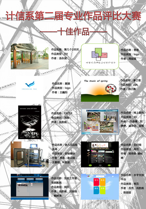经过前期宣传发动,大学生参赛踊跃,他们充分发挥自己的专业特长,创作设计出大量作品。经过海选,筛选出部分富有专业水准的作品进行现场决赛。进入决赛的作品都是大学生灵感和智慧的结晶,视角独特,构思新颖,既能体现学校水文化之精髓又能彰显计算机类专业之特色,作品以“网页设计”、“Flash”、“海报设计”、“LOGO”、“产品展示”、“DV”以及“挑战杯参赛获奖作品”等多种形式展示。经过评委的严格评审,十位参赛选手的作品最终脱颖而出,既有独著也有集体智慧的结晶。获奖作品为郑荷艳等同学的网页设计《泊问馆》、苏芳等同学设计的网页《水专交流平台》、肖胜桃等同学设计的网页《东旭工作室签到系统》、王巍钧设计的LOGO《展翅》、肖胜桃设计的LOGO《ENTER》、周益斌设计的LOGO《善思》、汤永斌制作的DV《第几个一百天》、周小雅制作的ppt《春之歌》,李涛等同学设计的《嵌入式远程水闸控制模块》和任俞倩设计的《3D网上超市》。