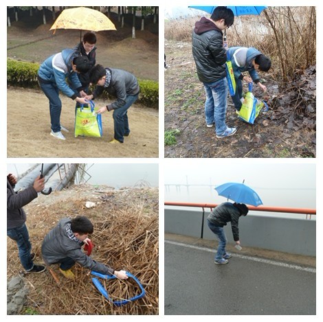 3月4日下午,市政系环保协会由会长丁向坡带队,冒雨前往钱塘江边清理垃圾。由于长时间下雨,钱塘江边的垃圾显得并不是很多,但也因为雨水增大了此次活动的难度。很多包装袋都浸泡在水中,会员们不惜湿了鞋子也把要浸泡的废弃物捡出来。这种精神深深感染了一位丢了垃圾的路人,羞愧的把自己刚丢的餐巾纸捡了起来。