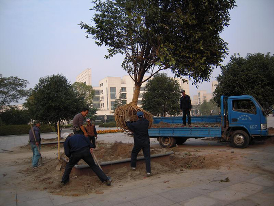 2003年学校迁入新校区后,按规划种植了一大批各式树木。受土质、水文影响,学校生活区树木生长略好于教学区,密度也大于教学区。这次后勤服务中心经过慎密计划,决定对生活区、教学区绿化疏密进行部分调整,把原学校南大门广场的十余棵杜英树搬移到南湖边上,再把生活区13棵桂花树迁移到杜英树的位置,使学校南大门广场更加庄重、大方、安静,为校园环境添彩人文氛围。