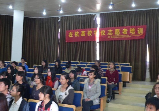 本次培训由费佳老师(杭州市志愿者协会礼仪培训老师)主讲,她从基本礼仪背景知识概述、个人礼仪、交往礼仪和会议礼仪等方面进行讲授,并亲自指导同学们作为礼仪志愿者基本的站姿、坐姿等,纠正了同学们基本的错误,让培训的同学们能从理论和实践中学到相关的礼仪知识。