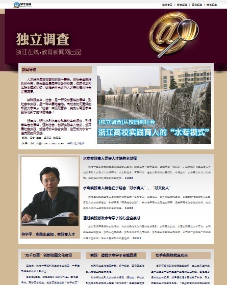 为强化文化育人,学校不断在内涵、特色上下功夫,丰富学校校园文化品牌内涵。学校始终坚持“统筹整合、全程贯穿”的原则,将实践育人与学校办学特色、办学理念相结合,把社会主义核心价值体系融入在实践育人各环节,引领学生走出课堂,迈向社会。今年,永利 “双千双百”主题实践教育活动荣膺“2012年浙江省高校校园文化品牌”、“2012年全国高校校园文化建设优秀成果二等奖”(已公示)。如今,学校实践育人又成为水专一大特色亮点,引起了《浙江在线》等媒体的关注。浙江在线制作了专题,对此进行系列报道。