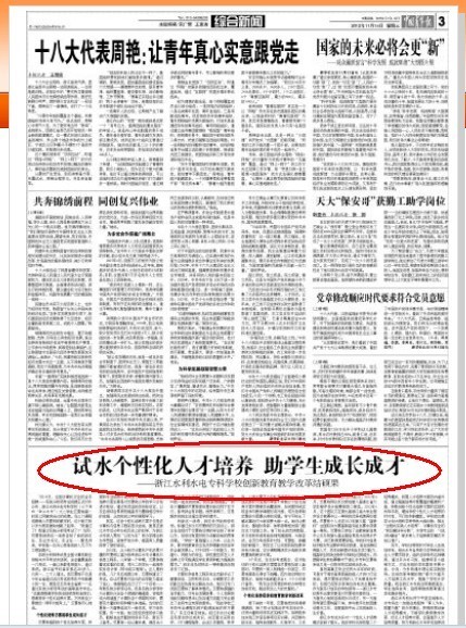 为推进学生素质教育,学校深化SWH-CDIO高素质技能型人才培养模式,不仅将SWH-CDIO试点专业从原来的两个扩展到四个,制订出了一整套完整的一体化人才培养方案、课程体系和符合学校长远发展的SWH-CDIO愿景、能力大纲、评判标准,而且还率先把职业核心软能力渗透到第一课堂中,通过 “水的品质”、“水利精神”潜移默化地熏陶感染,实现学生软硬能力均衡全面发展。学校的这一创新做法吸引了《中国教育报》的关注。