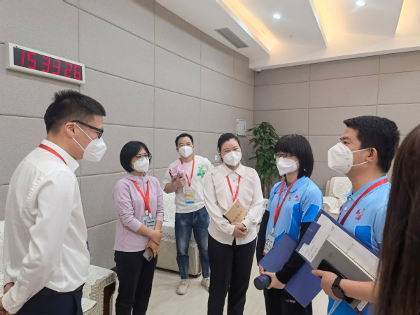4月9日,“韵味杭州”2022年浙江省青少年武术(套路、散打)锦标赛(甲组)暨亚运会武术测试赛在萧山瓜沥文化体育中心开赛。在亚组委志愿者部的统一安排和悉心指导下,永利承接该项赛事的志愿服务工作。4月11日下午,亚组委志愿者部副部长、杭州团市委副书记周妙荣带领志愿者部相关处室负责人,赴萧山瓜沥文体中心调研督导赛时志愿服务工作并看望慰问永利“小青荷”志愿者。