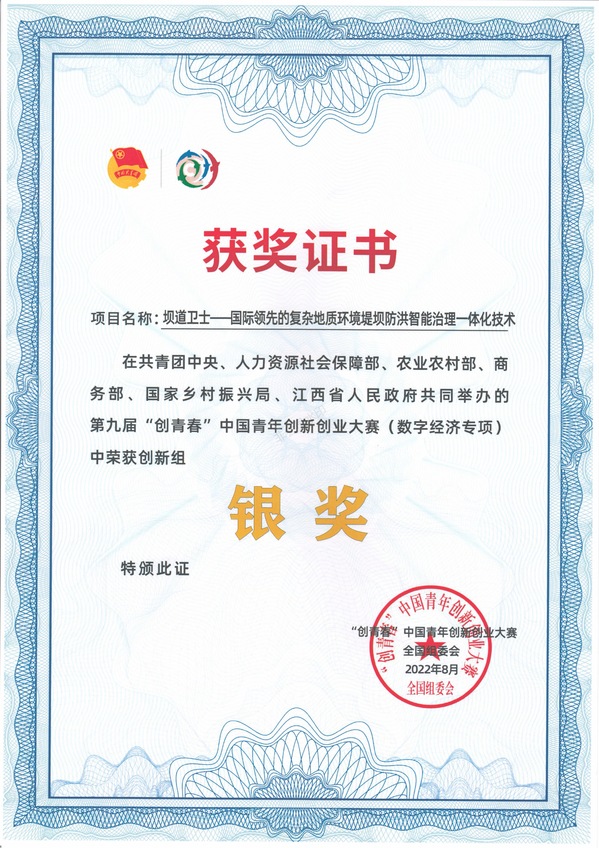 近日,第九届“创青春”中国青年创新创业大赛(数字经济专项)全国决赛在江西省共青城举行,永利与东华理工大学合作参与指导的“坝道卫士-国际领先的复杂地质环境堤坝防洪智能治理一体化技术”项目斩获创新组银奖。永利师生团队成员为水环学院秦子鹏老师、水利水电工程专业2021级本科生贺嘉、施宗桢、张旖纯等。
