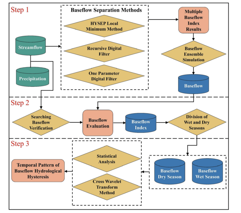 水环学院黄赛花副教授团队陈浩博士在水文与水资源领域顶级期刊《Water Resources Research》上发表了题为"Using Baseflow Ensembles for Hydrologic Hysteresis Characterization in Humid Basins of Southeastern China"的研究论文。yl7703永利集团为第一单位,浙江省农村水利水电资源配置与调控关键技术重点实验室为第二单位,论文第一作者为陈浩博士,通讯作者为黄赛花副教授。该研究以中国南方湿润地区浙江省内主要流域作为研究对象,采用多元线性回归模型对三种主流基流分割方法的结果进行集合模拟,通过评估降雨和径流数据确定基流验证值,并使用性能指标来评估每种基流分割方法的模拟精度。使用基于基流指数的累积距离水平技术对水文年的丰枯水期进行分类,通过研究基流与降水之间的相关性,建立流域多时空尺度的基流水文滞后响应模式。该研究的方法和结果可作为湿润地区流域基流模拟的技术支撑,以及水资源评估和管理相关领域的决策基础。研究得到浙江省自然科学基金、国家自然科学基金、浙江省教育厅科研基金、国家重点研发计划等项目资助。