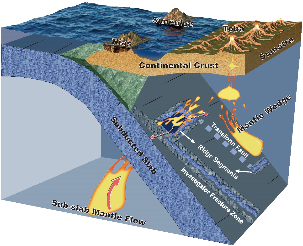 被动源地震观测研究表明,在苏门答腊北部存在板块撕裂。由于地台站分布稀疏,从而分辨率不足,导致俯冲板块形态不太确定,撕裂的存在也尚未得到充分验证,因此板块撕裂的主要因素也难以辨别。该研究利用大规模地震数据集,获得了高精度的区域地震重定位结果和三维高分辨率地壳和上地幔的P波层析成像模型。地震重定位结果展示一个沿着研究者破碎带的舌状突出地震群,表明研究者破碎带的高地形可能增强了俯冲板块和上覆板块之间的耦合。由俯冲板块中的不同耦合差异而产生的剪切力可能在残留扩张脊的对应区域形成了一个力学薄弱区域,最终导致了板片窗的形成。对应板片窗区域,沿着俯冲板块提取的重定位地震显示出地震空白区。另外,横切俯冲板片的层析成像切片显示出一个明显的低速通道。结合层析成像、地震定位和弧后富钾火山产物特征提出苏门答腊北部下方的俯冲板块存在一个板块窗,该板块窗允许来自俯冲板块下方区域的地幔物质流动到地幔楔并参与Toba火山岩浆作用。