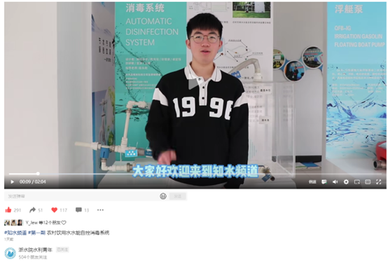 3月17日,该频道推出了第一期视频,由水工21-4仇培盛主讲,该同学曾获2023年全国水创大赛特等奖,也是今年校“十佳大学生”候选人。该视频介绍并演示了一种新型水处理装置——农村饮用水水能自控消毒系统。不到一天的时间,视频点赞量已超400次。
